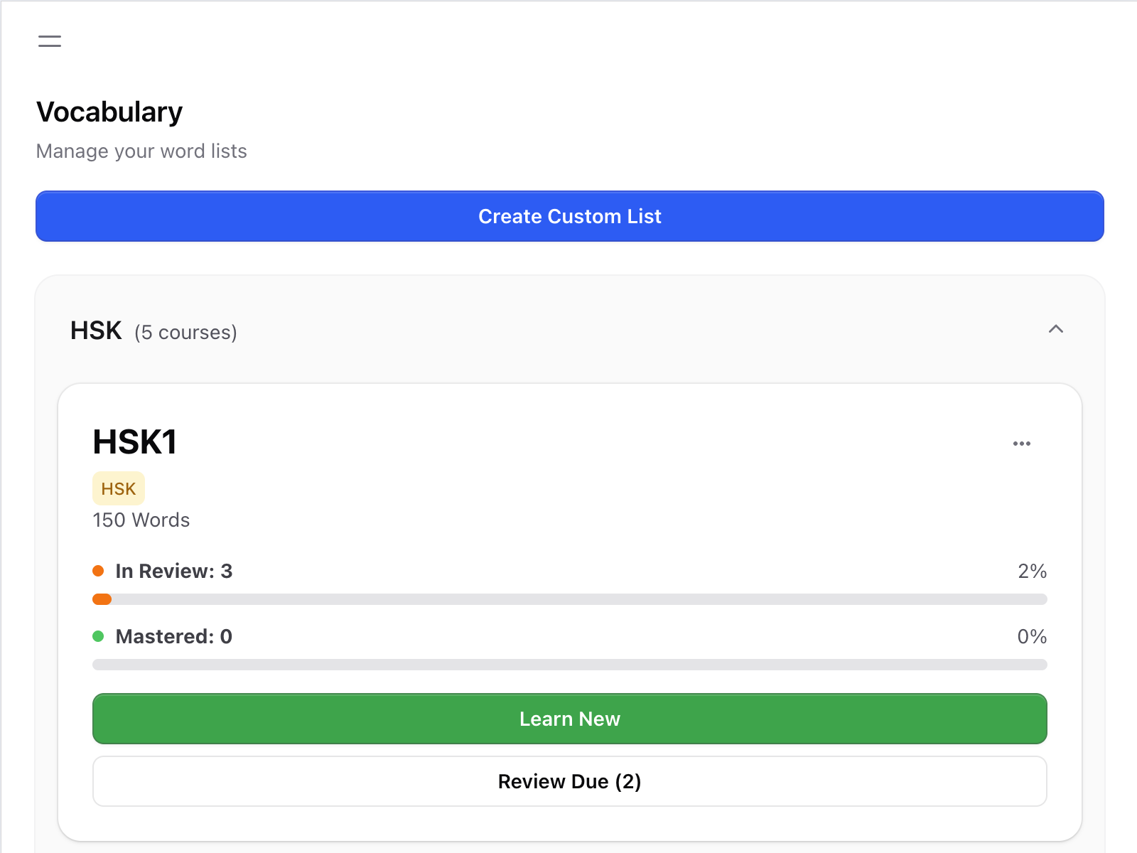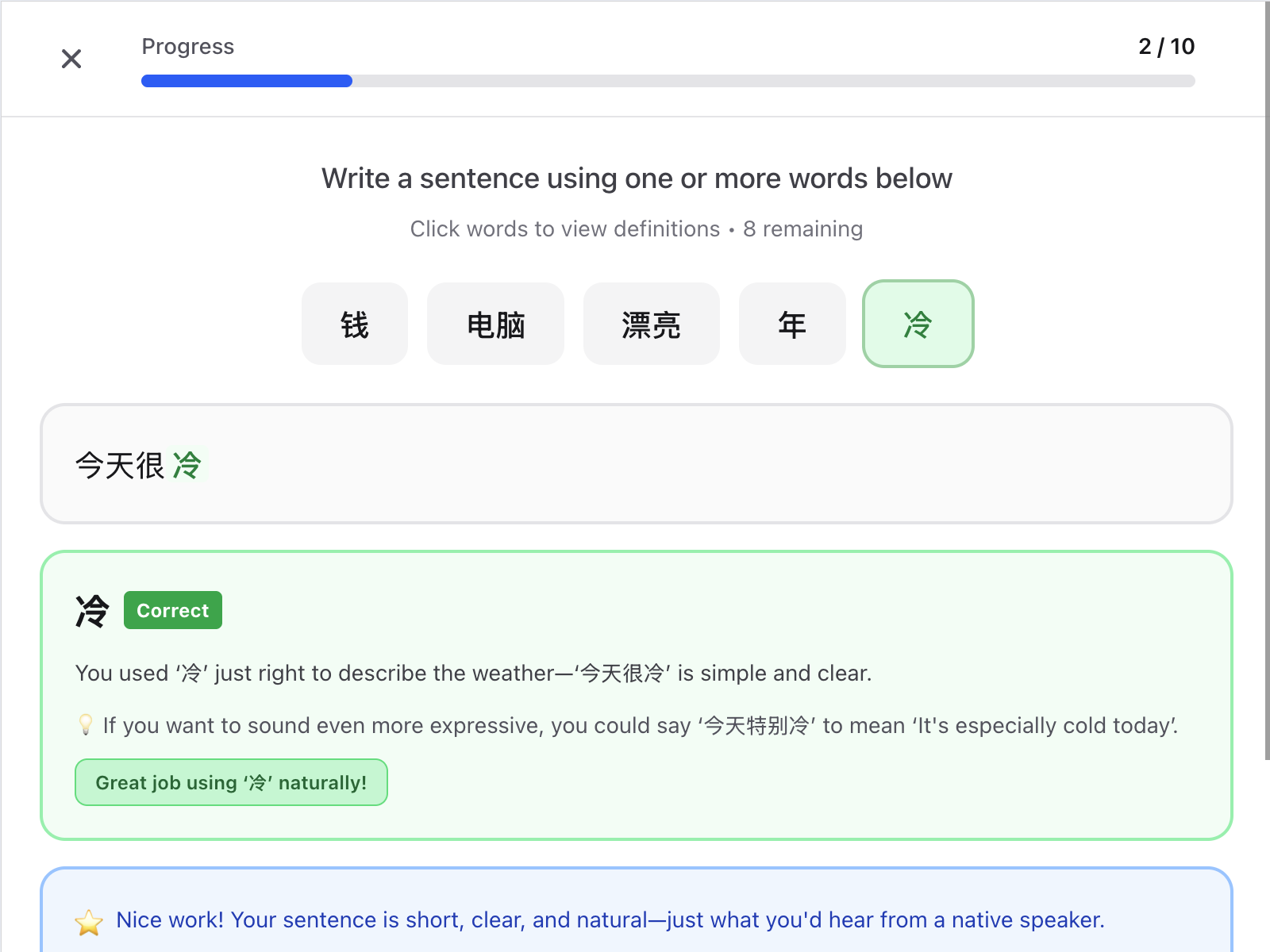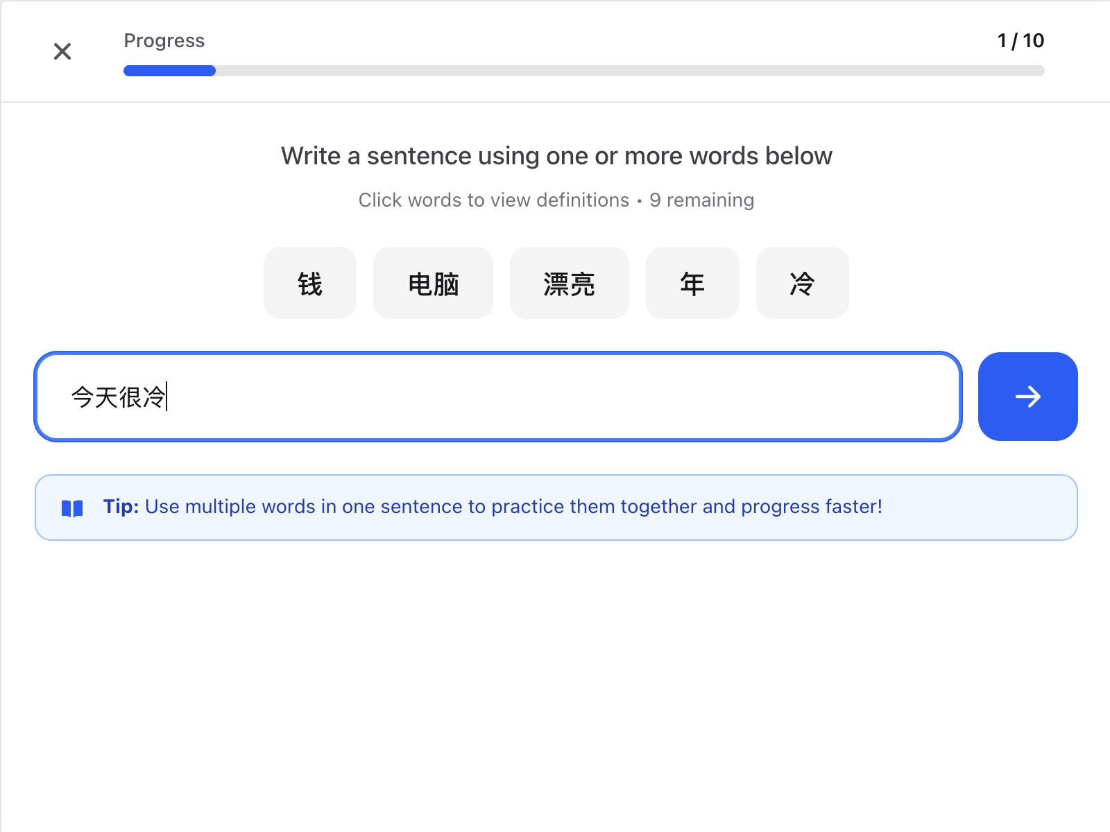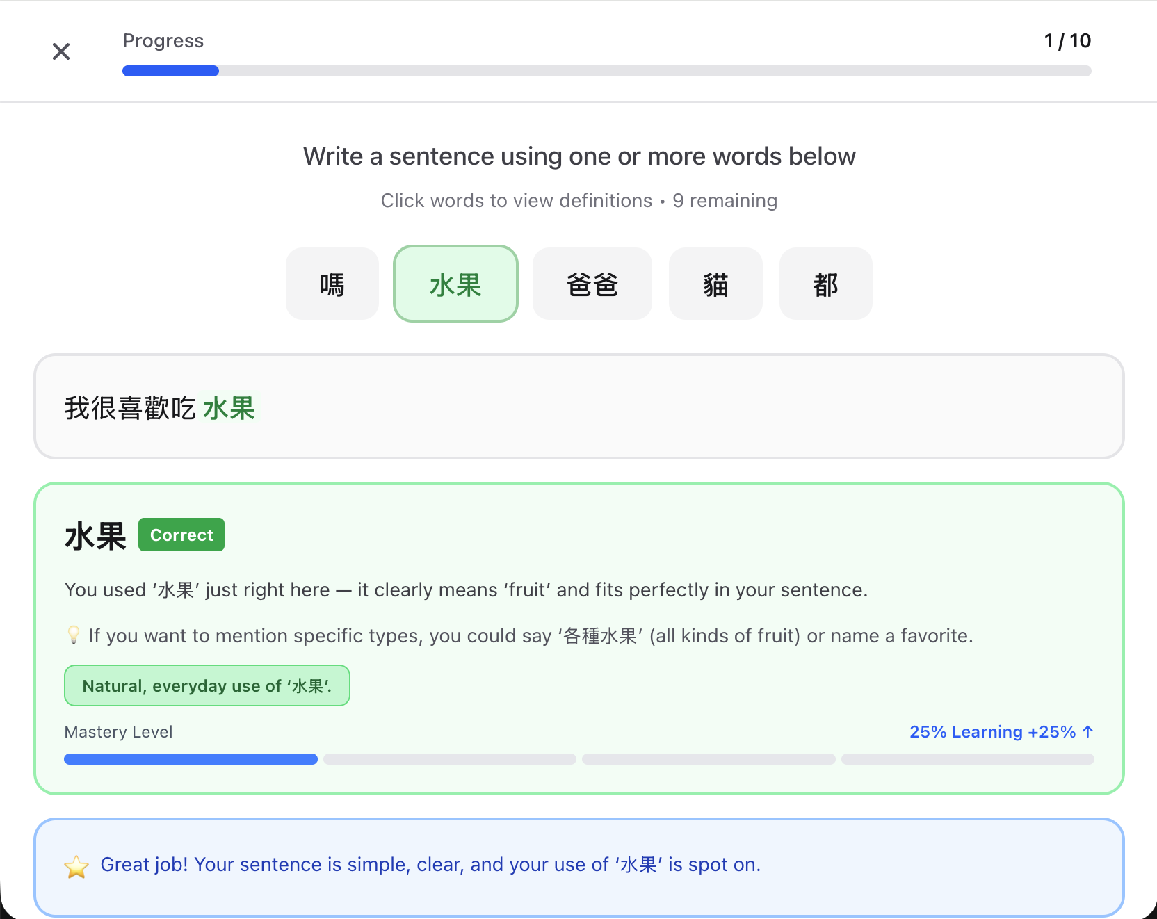 Structured practice with spaced repetition. Write sentences, get feedback, and review at the perfect time to make words stick.
